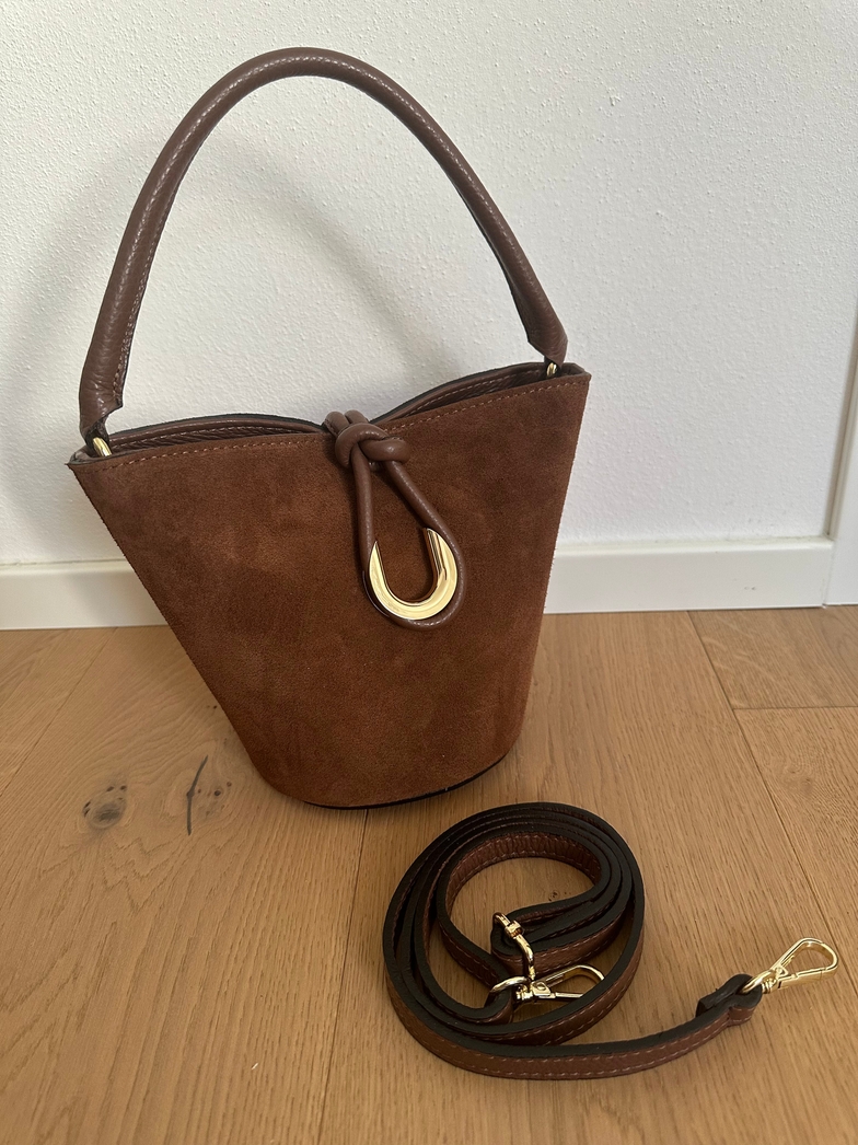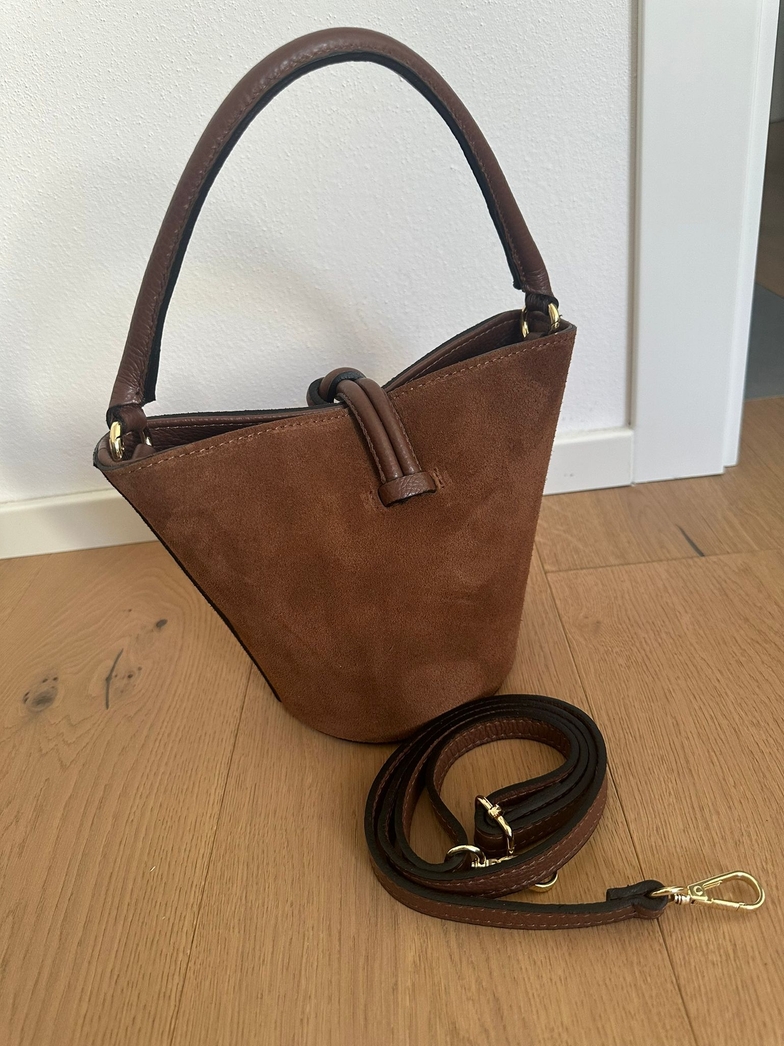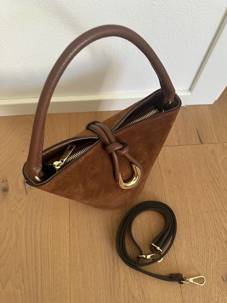 Bolsa bucket em pele genuína e camurça genuína Feita em Itália. Fecho especial com zíper + gancho, alça para ser transportada à mão e alça ajustável e removível incluída. Interior forrado em tecido num único compartimento com bolso com zíper.