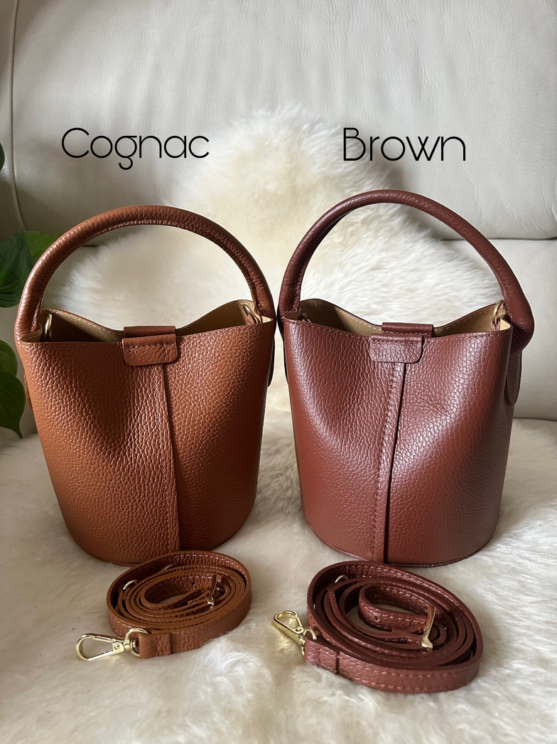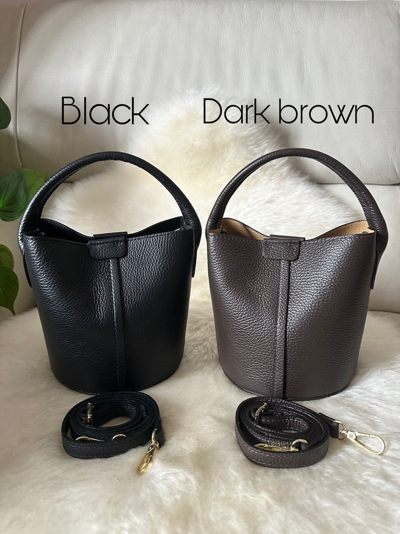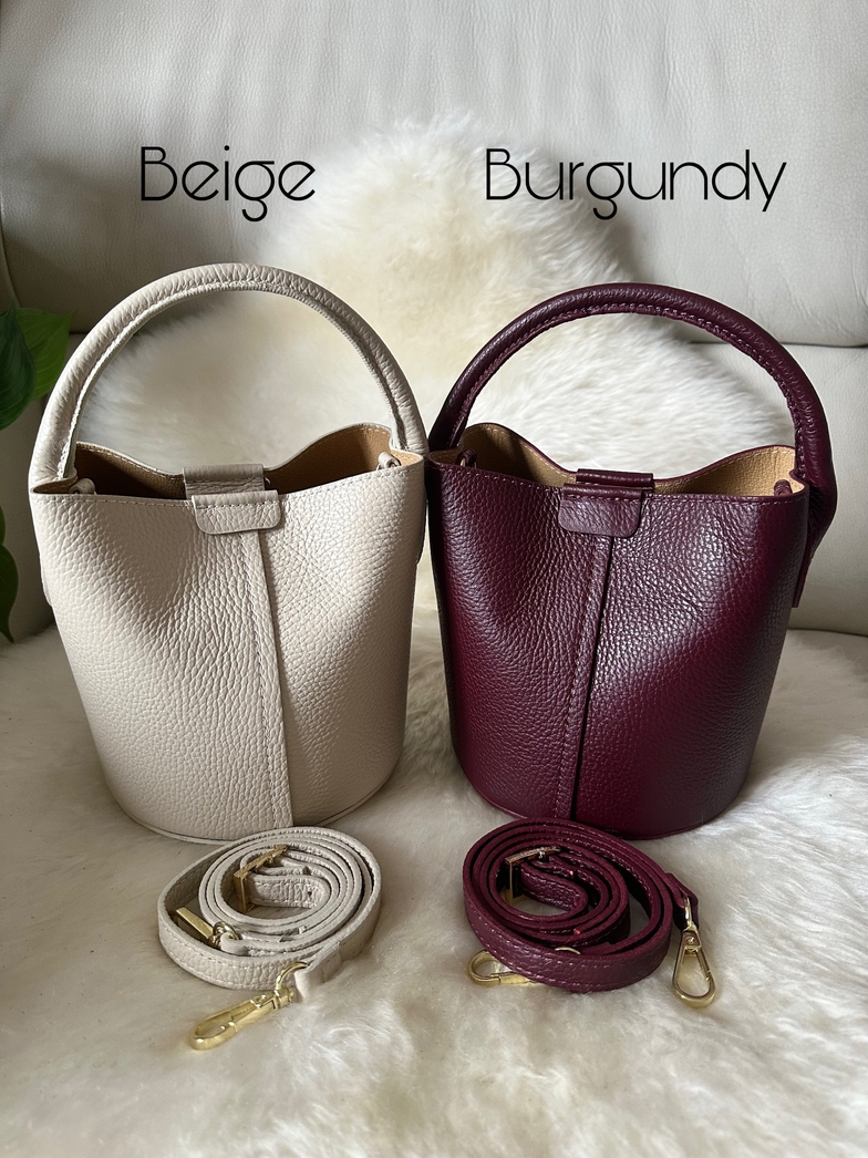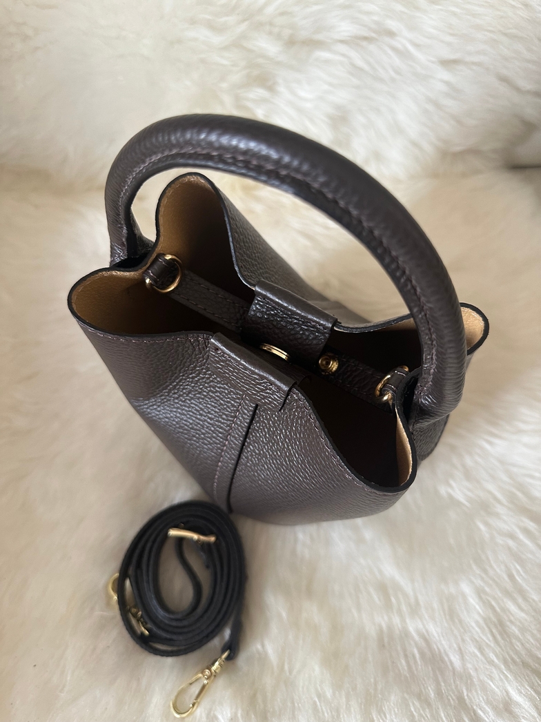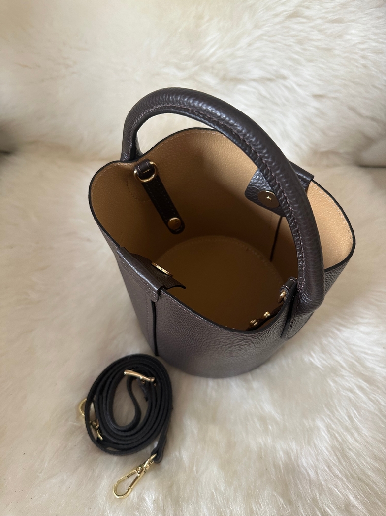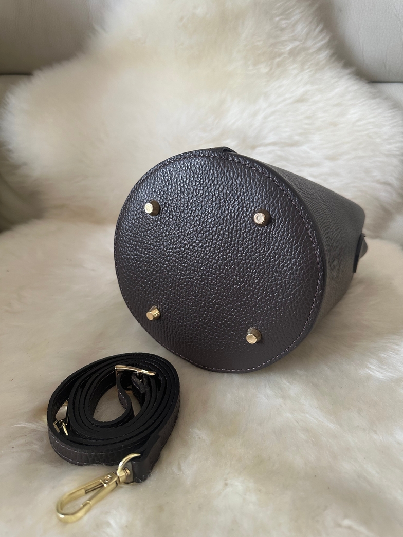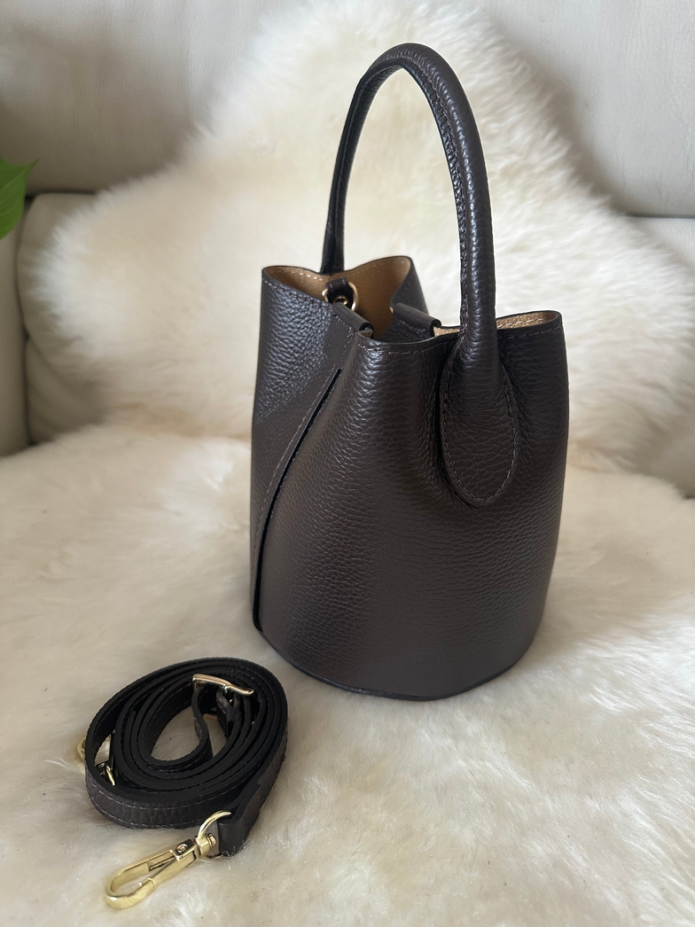 Bolsa balde em pele genuína de alta qualidade, fabricado em Itália, uma combinação perfeita de estilo e funcionalidade. Esta bolsa tipo balde é ideal para te acompanhar a qualquer lugar, desde o dia no escritório até ao passeio da tarde. Pode ser transportada tanto à mão como com a sua alça ajustável correspondente.