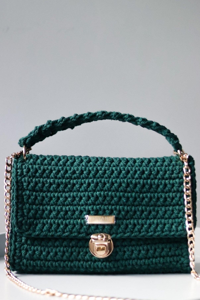 A bolsa verde profundo é feita à mão com 100% algodão. Possui uma alça traseira tricotada que confere um aspecto autêntico e funcionalidade.